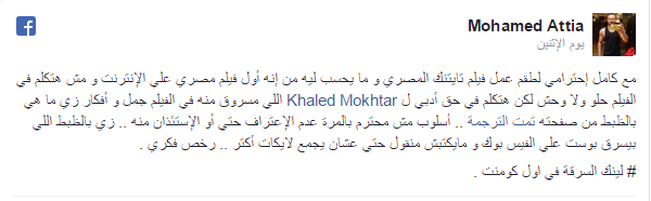 – نشر صاحب الفكرة الاصلية ، خالد مختار ، منشورا علي صفحته الشخصية ، يؤكد سرقة فكرة الفيلم وحواره كاملا .