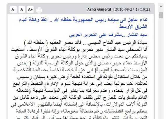 وأضاف: أستغيث بسيادتكم “سيادة الرئيس” لما نعرفه من نصرتكم للمظلومين، إنقاذ وكالة أنباء الشرق الأوسط المصرية التي كانت من خلال قياداتها العظماء في السابق، المصدر الرئيسي للأخبار داخلياً وخارجياً، إنقاذها من علاء حيدر الذي نشر عنه منذ أسابيع على المواقع الإخبارية تحت عنوان عزبة علاء حيدر.. وكالة أنباء الشرق الأوسط سابقاً، والتي قال فيها كاتب الخبر: إن علاء حيدر حول وكالة أنباء الشرق الأوسط التي يديرها حسبما يشاء ووفق وجهة نظره القاصرة التي حولت أكبر «وكالة إخبارية» إلى أكبر «خرابة قومية»، وتمكن باتصالاته من حذف هذا الخبر من الموقع الإخباري وتقديم بلاغ للنائب العام ضد صاحب الموقع الإخباري.