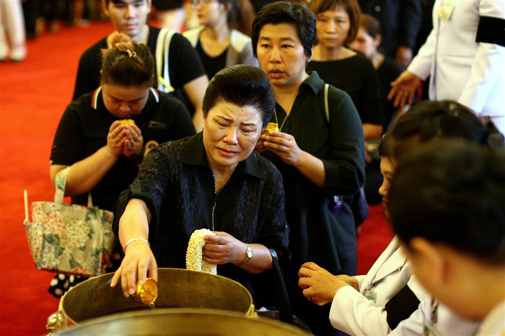 كما علق الناعيين للملك أوسمة ودبابيس عليها صوراً للعائلة المالكة، ورفع التايلانديين، العملات الوطنية وعليها صورة بوميبول أدولياديج، أثناء انتظار الموكب لنقل جثمان الملك خارج مستشفى سيريراج.