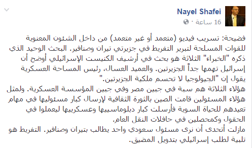 وفي نهاية التسريب جاء العميد بحري أشرف نبيل العسال، رئيس شعبة المساحة البحرية بالقوات المسلحة، والذي أكد أنه لا القرب المكاني ولا صور الأقمار الصناعية، ولا الجيولوجيا والمسح البحري تحسم قضية الجزر، ولكن اتفاقيات الدول هي التي تفعل، مشيراً إلى أن ترسيم الحدود مع المملكة بدأ من 2007 وليس الآن، ولكن الظروف لم تكن مواتية، ولم يوضح لماذا كانت غير مواتية وقتها وأصبحت مواتية الآن.