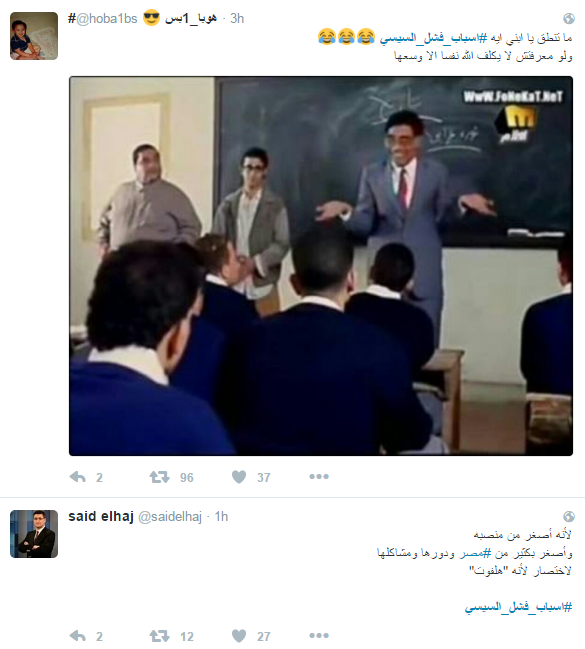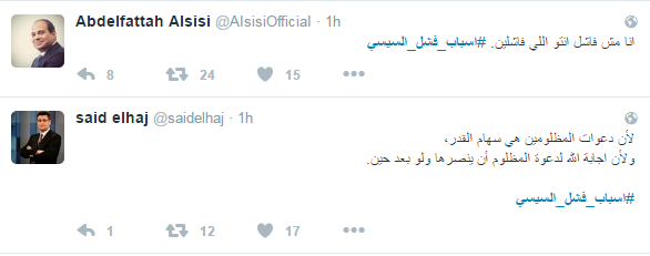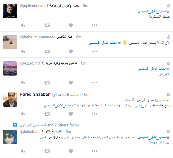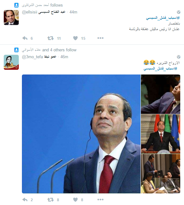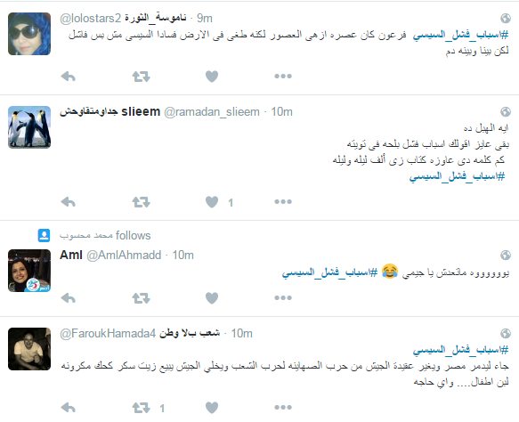 ودعا المشاركون الى رحيله، مؤكدين أن الحكم العسكري فشل في إدارة البلاد، وحصل هاشتاج “#اسباب_فشل_السيسي” على التريند الأول بموقع التواصل “تويتر”، وجاءت التغريدات كالتالي ..