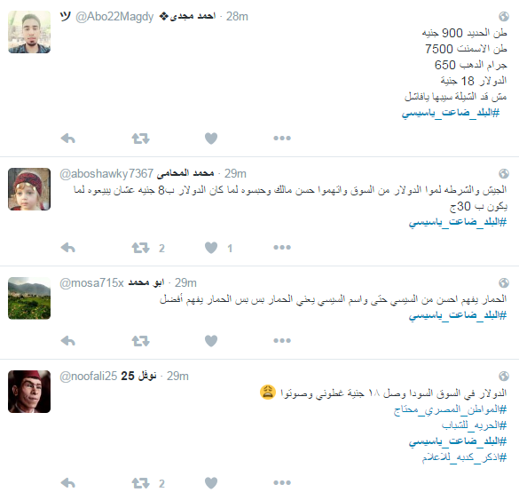 دشن نشطاء موقع التواصل الاجتماعى “تويتر” هاشتاج تحت وسم “البلد_ضاعت_ياسيسي”، طالب فيه المشاركون برحيل السيسي وحكم العسكر، لما تشهده البلاد من تدهور اقتصادي وزيادة الأسعار بشكل جنوني، وارتفاع سعر الدولار والذى تخطى حاجز الـ 18 جنيهًا.