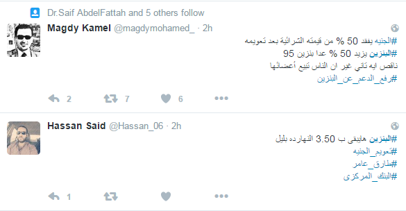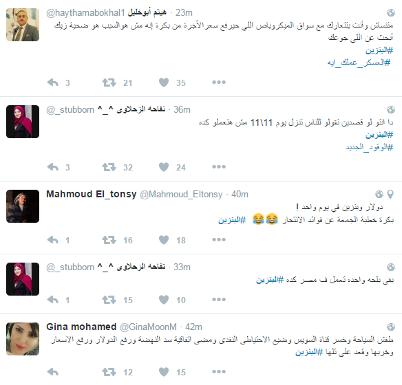دشن نشطاء موقع التواصل الاجتماعي “تويتر” هاشتاج تحت وسم “#البنزين”، بعد قرار للحكومة، منذ قليل، برفع الدعم عن البنزين، وأعرب المشاركون عن استياءهم من الإجراء، لاسيما بعد قرار تعويم الجنيه، أمس الخميس، هذا الى جانب ارتفاع الأسعار المتزايد بسبب تعويم الجنيه وارتفاع سعر الدولار.