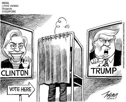 وقبل الانتخابات الأميركية بساعات قليلة، نشرت “نيويورك تايمز” كاريكاتير يعبر عن التصويت لمرشحي الرئاسة “كلينتون وترامب”.