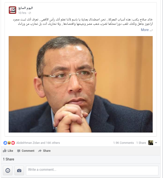 وفي رد على باسم يوسف، نشر خالد صلاح تدوينة على الصفحة الرسمية لليوم السابع بموقع التواصل الاجتماعي، فيسبوك، قال فيها: “هذه أسباب المعركة.. نحن اصطدناك بعناية يا باسم لأننا نعلم أنك رأس الأفعى.. نعرف أنك لست مجرد أراجوز جاهل ولكنك تلعب دورا محكما لضرب شعب مصر وجيشها واقتصادها.. ولا نحاربك أنت بل نحارب من وراءك.. سخريتك موظفة في سياق التشكيك في جيش مصر ولم يعد هناك وقت للتعامل مع اللجان الإلكترونية وترك الأفاعي الكبيرة مثلك تزرع الريبة في قلوب الشباب..”
