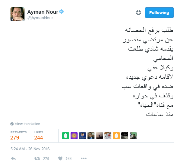 وكتب نور فى تدوينة له على موقع التواصل العالمي “تويتر”: “طلب برفع الحصانة عن مرتضى منصور، يقدمه شادي طلعت المحامي، وكيلاً عني لإقامة دعوى جديدة ضده في واقعات سب وقذف، في حواره مع قناه”الحياة” منذ ساعات”.