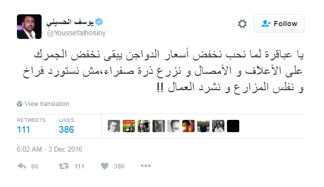 وقال الحسيني، في تدوينة عبر حسابه الشخصي على موقع التدوين العالمى “تويتر”: “يا عباقرة لما نحب نخفض أسعار الدواجن، يبقى نخفض الجمرك على الأعلاف والأمصال، ونزرع ذرة صفراء، مش نستورد فراخ ونفلس المزارع ونشرد العمال!!”.