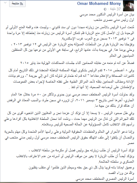ونشر عمر مرسي نجل الدكتورمرسي بيان باسم الأسرة علي صفحته الشخصية “فيس بوك”، جاء فيه:” مُنعت أسرة الرئيس بالأمس من زيارته مجددا دون اى سند قانوني ، وليست هذه واقعة المنع الأولى أو الوحيدة بل إن الأصل كان منع الزيارة فلم تتمكن أسرة الرئيس من زيارته منذ إختطافه إلا مرة واحدة فى ٧ نوفمبر ٢٠١٣ بسجن برج العرب غرب الإسكندرية، وفوجئنا بعد الزيارة بقرار من السلطات المسؤولة بمنع الزيارة عن الرئيس في ١٢ نوفمبر ٢٠١٣ ، وحتي يومنا هذا.. في جريمة بدأت عامها الرابع، فى سابقة هي الأولى من نوعها بين كل المعتقلين السياسيين فى العالم، فضلاً عن أنه تم منعه من مقابله المحامين أثناء جلسات المحاكمات الهزلية منذ يناير ٢٠١٥”