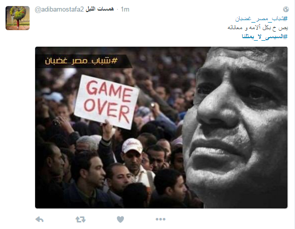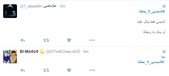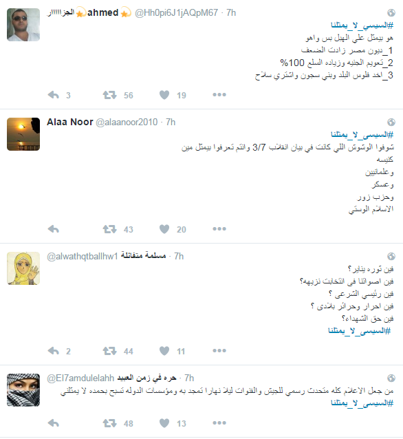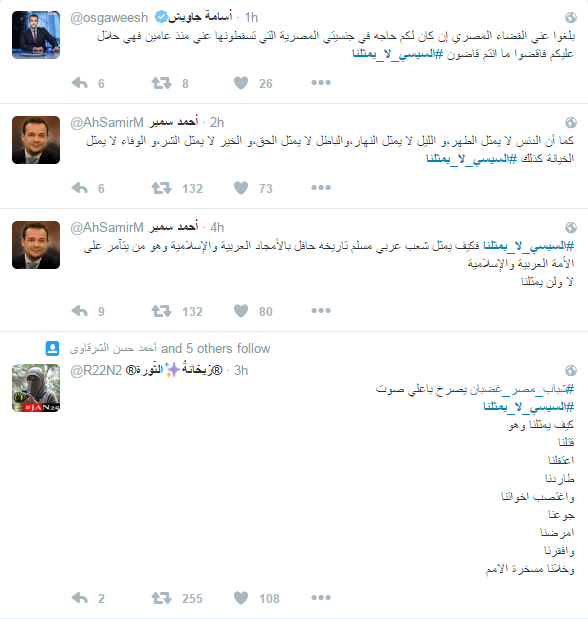 وشارك النشطاء تدوينة “السيسي بيمثل علينا” وأضاف أحدهم، “من جعل الإعلام كله متحدث رسمي للجيش والقنوات ليلاً نهارًا تمجد به ومؤسسات الدوله تسبح بحمده لا يمثلني”.