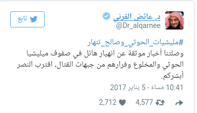 قال الداعية الاسلامي السعودي د. عائض القرني: إن النصر اقترب في اليمن ، مشيرا إلى انهيار جماعة الحوثي والجماعات الموالية لعلي عبدالله صالح.