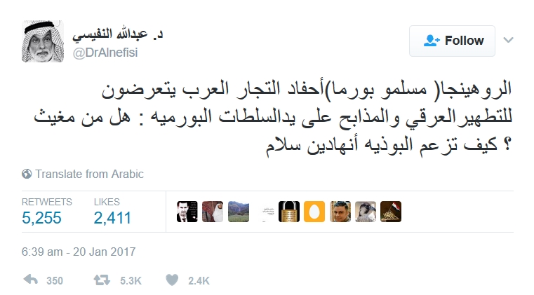 وقال النفيسي في تغريدة عبر حسابه الرسمي بموقع التدوينات القصيرة “تويتر”: “الروهينجا ( مسلمو بورما) أحفاد التجار العرب يتعرضون للتطهير العرقي والمذابح على يد السلطات البورميه، هل من مغيث؟ كيف تزعم البوذية أنها دين سلام؟”.