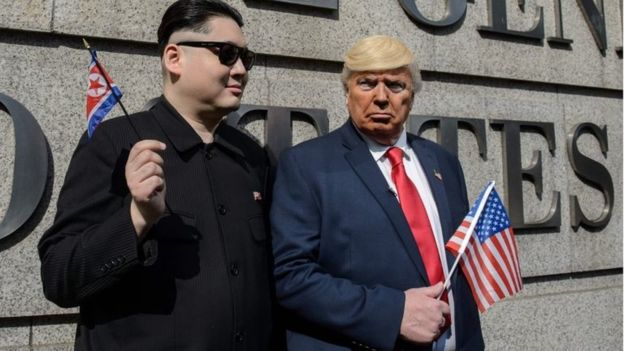 وتبادل الرئيسان المزيفان، العناق والقبلات، أثناء مرورهم في أكثر الشوارع ازدحامًا في المدينة، بعد أن أثنى كل منهما على الآخر في مشهد هزلي لا يمكن أن يصدق حدوثه بين ترامب و “كيم كونج”.