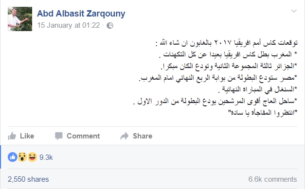 أثار شاب مغربي دهشة متابعي مواقع التواصل الاجتماعي بعد أن نشر توقعاته لمسار كأس الأمم الأفريقية، في يوم انطلاق البطولة، والتي بالفعل تحققت حتى الآن.