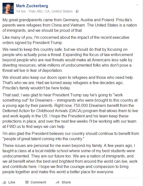 وقال زوكربرج في تدوينة له على موقعه: “أجدادي ينحدرون من ألمانيا والنمسا وبولندا، أما (زوجتي) بريسكيلا، فكان والداها لاجئين من الصين وفيتنام.. الولايات المتحدة أمة مهاجرين، وعلينا أن نكون فخورين بذلك”.