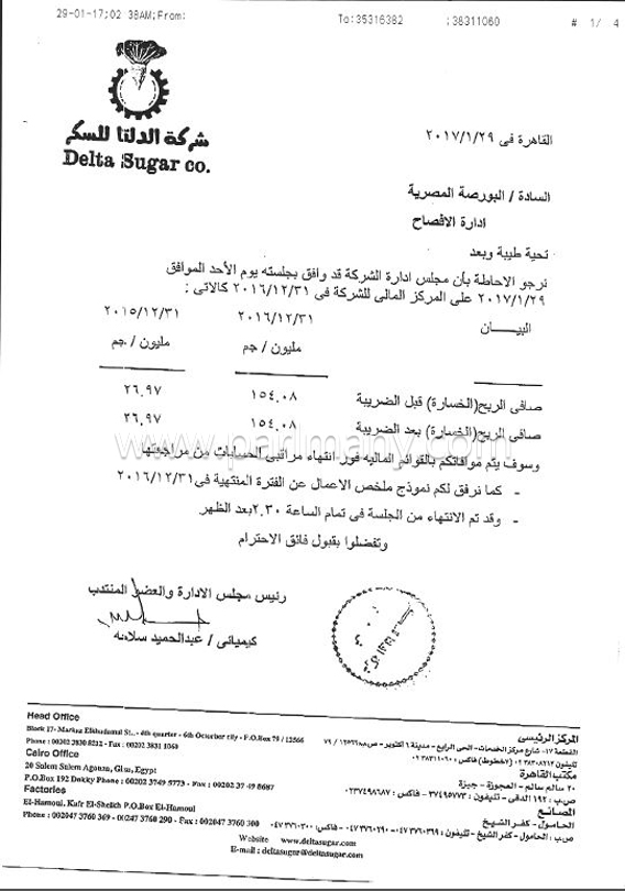 كشفت القوائم المالية للبورصة المصرية عن أن شركة الدلتا للسكر التابعة للشركة القابضة للصناعات الغذائية، تربحت خلال عام 2016م، 154 مليون جنيه بنسبة 471%، وبزيادة 128 مليون جنيه عن العام المالى السابق 2015 وجاءت هذه الزيادة نتيجة ارتافع نسبة المبيعات بواقع 59%.