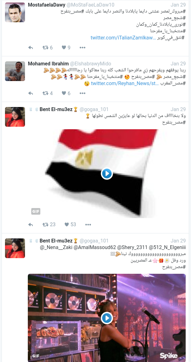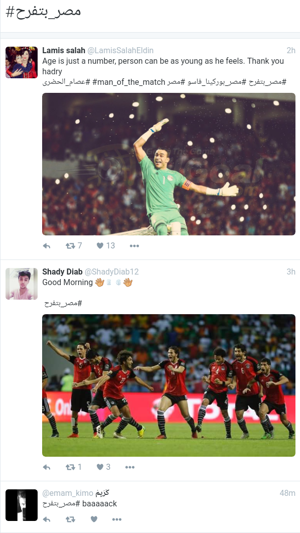 تصدر هاشتاج “مصر بتفرح” موقع التدوينات القصيرة “تويتر”، بعد فوز المنتخب الوطنى على منتخب بوركينا فاسو في ركلات الترجيح بعد تعادل الفريقين خلال اللقاء 1/1.