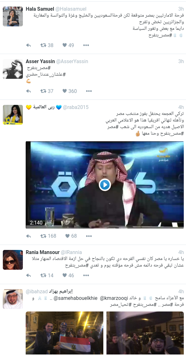 وتصدرت العديد من التعليقات العربية الهاشتاج، في الوقت الذي تمنت فيه تعليقات أخرى أن تنتقل هذه الانتصارات إلى السياسة والاقتصاد، كما أظهرت التعليقات الوحدة بين الشعب المصري والعربي.