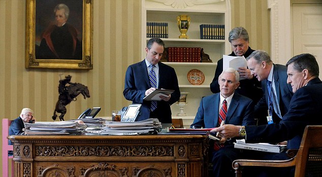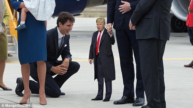 ويظهر الرئيس الأميركي بشكل مصغر أمام قادة وزعماء العالم، منهم رئيس الوزراء الكندي، والرئيس الأميركي السابق باراك اوباما، والرئيس الروسي فلاديمير بوتين، بالإضافة إلى بعض الشخصيات العامة وأبرزهم زوجته ميلانيا ترامب.