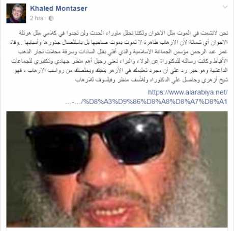 وقال في تدوينه له على “الفيسبوك”: “وفاة عمر عبد الرحمن مؤسس الجماعة الاسلامية والذي أفتى بقتل السادات وسرقة محلات تجار الذهب الأقباط وكانت رسالته للدكتوراه عن الولاء والبراء يعني رحيل أهم منظر جهادي وتكفيري للجماعات الداعشية وهو خير رد علي أن مجرد تعليمك في الأزهر لا ينقيك ويخلصك من رواسب الإرهاب، فهو شيخ أزهري وحاصل على الدكتوراه وللأسف منظر وفيلسوف للإرهاب”..