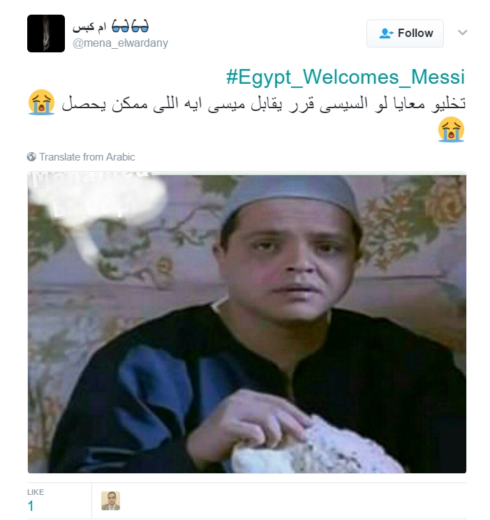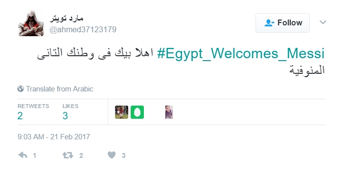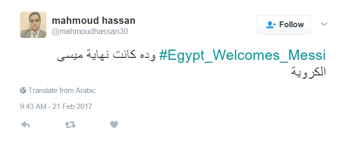 ودشن رواد موقع التدوينات الصغير “تويتر” هاشتاج باسم ” #egypt_welcomes_messi”، للترحيب باللاعب على أرض مصر، ليتصدر قائمة الأوسمة الاكثر انتشارًا في مصر.