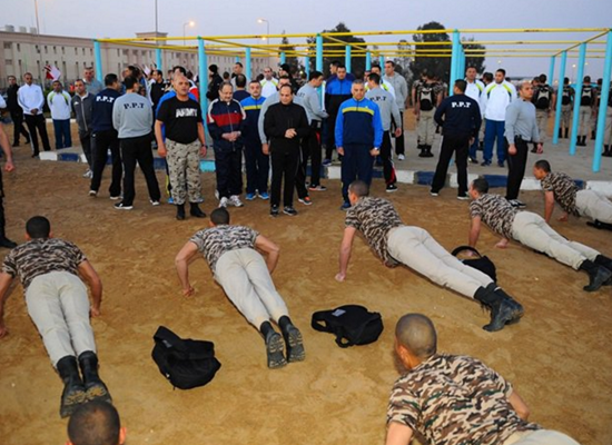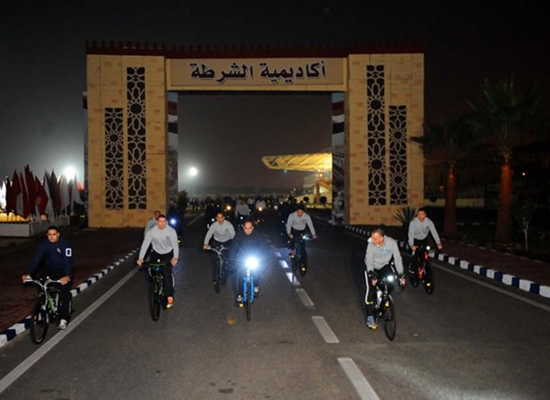وبعد الانتهاء من الطابور العسكري، اتجه السيسي مع طلبة الكلية في جولة بالدراجات في شوارع القاهرة، ثم شهد قيام عدد منهم بقفزة الثقة في حمام السباحة؛ ليختم زيارته بتناول طعام الإفطار مع الطلبة.