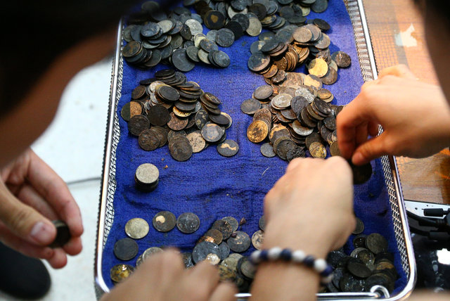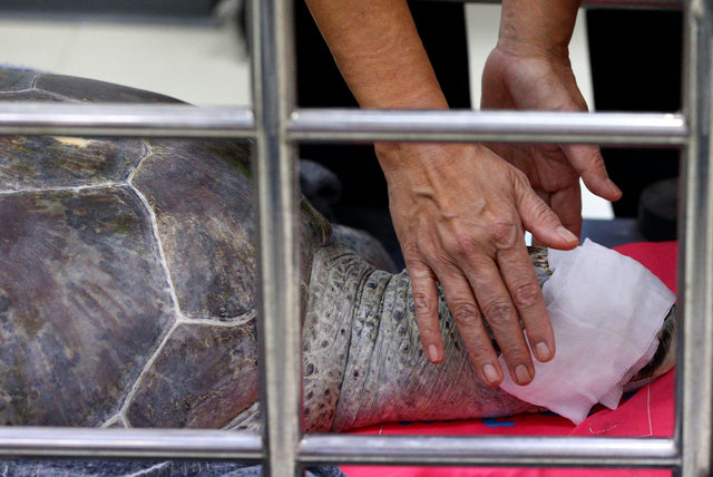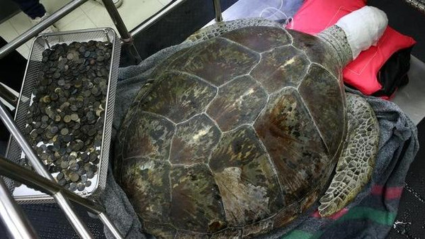 أجرى أطباء بيطريون من تايلاند، أمس الإثنين، عملية جراحية لسلحفاة بحرية، ابتلعت 915 عملة معدنية من العملات التي تلقى في بركتها طلبا للحظ السعيد، مما حد في نهاية المطاف من قدرتها على الحركة.