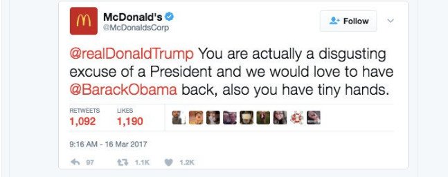 وبعد انتشار التغريدة، التي نشرت على الحساب الموثق الرسمي لشركة ماكدونالدز، أعلنت الشركة أن الحساب كان مخترقًا؛ ومن ثم تم حذف التغريدة.