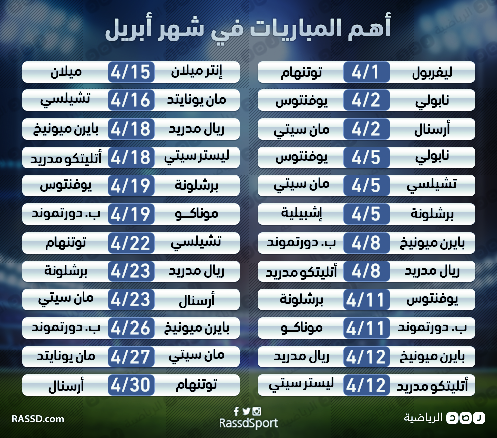 في هذا الإنفوجراف، يستعرض “رصد” قائمة بأهم المباريات في شهر أبريل: