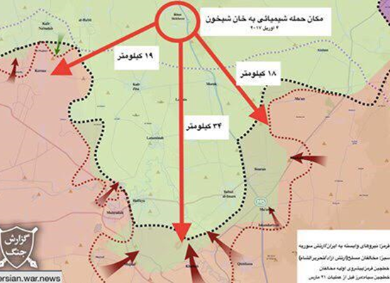 وقال الموقع، إن الهجوم على خان شيخون، جاء من اجل حماية القوات البرية الإيرانية، ومليشيات حزب الله، التي توجد على بعد كيلومترات قليلة عن مكان القصف، مشير إلى أن شمال حماة أصبح مكانا تتمركز فيه القوات الإيرانية.