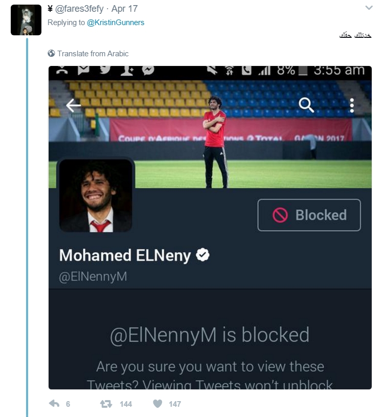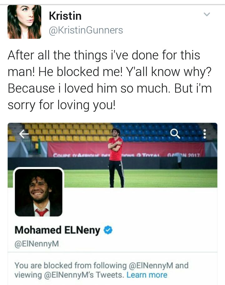 أثارت تغريدة نشرها حساب باسم “كريستين”، لصورة توضح حظرها من قبل لاعب الأرسنال محمد النني ، ضجة عارمة على مواقع التواصل الاجتماعي، الذين أظهروا تعاطفا مع الفتاة.