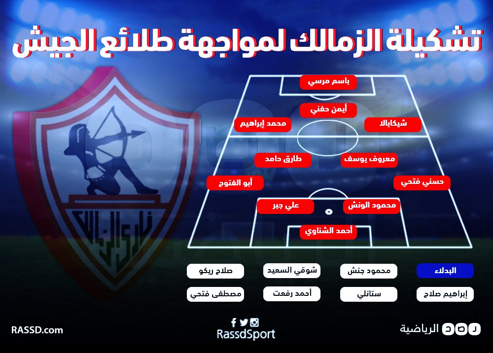 خط الوسط: طارق حامد ومعروف يوسف ومحمد إبراهيم ومحمود عبد الرازق (شيكابالا).