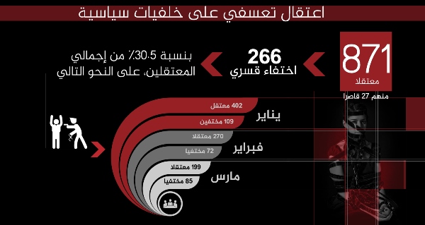 أما الاعتقال التعسفي دون أذون نيابية أو تهمٍ واضحة، فبلغت حالاته في الربع الأول من 2017 عدد 871 معتقلًا؛ منها 266 حالة اختفاء قسري، تمثل 30% من إجمالي المعتقلين في تلك الفترة، على نحو بلغ في شهر يناير 2017 عدد 402 معتقل و109 مختفين قسريًا، وفي فبراير 270 معتقلًا و72 مختفيًا قسريًا، وفي مارس 199 معتقلًا و85 مختفيًا قسريًا.