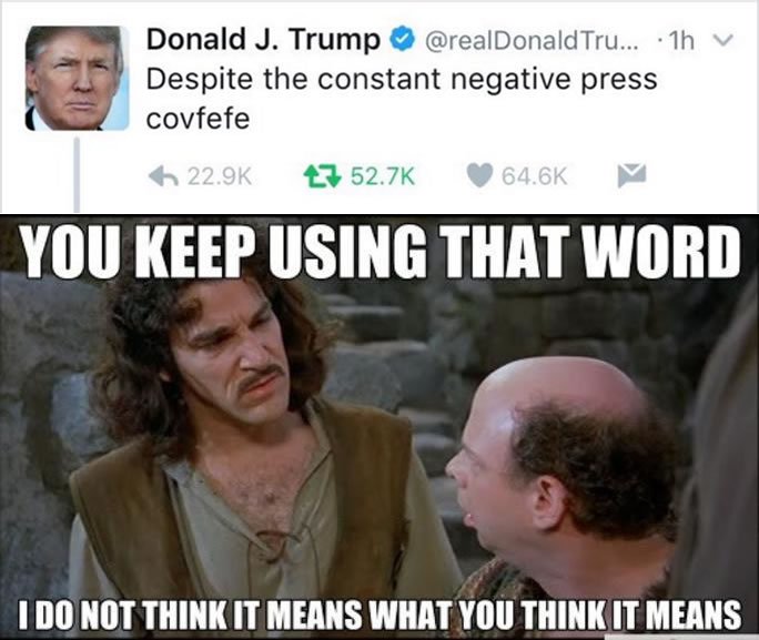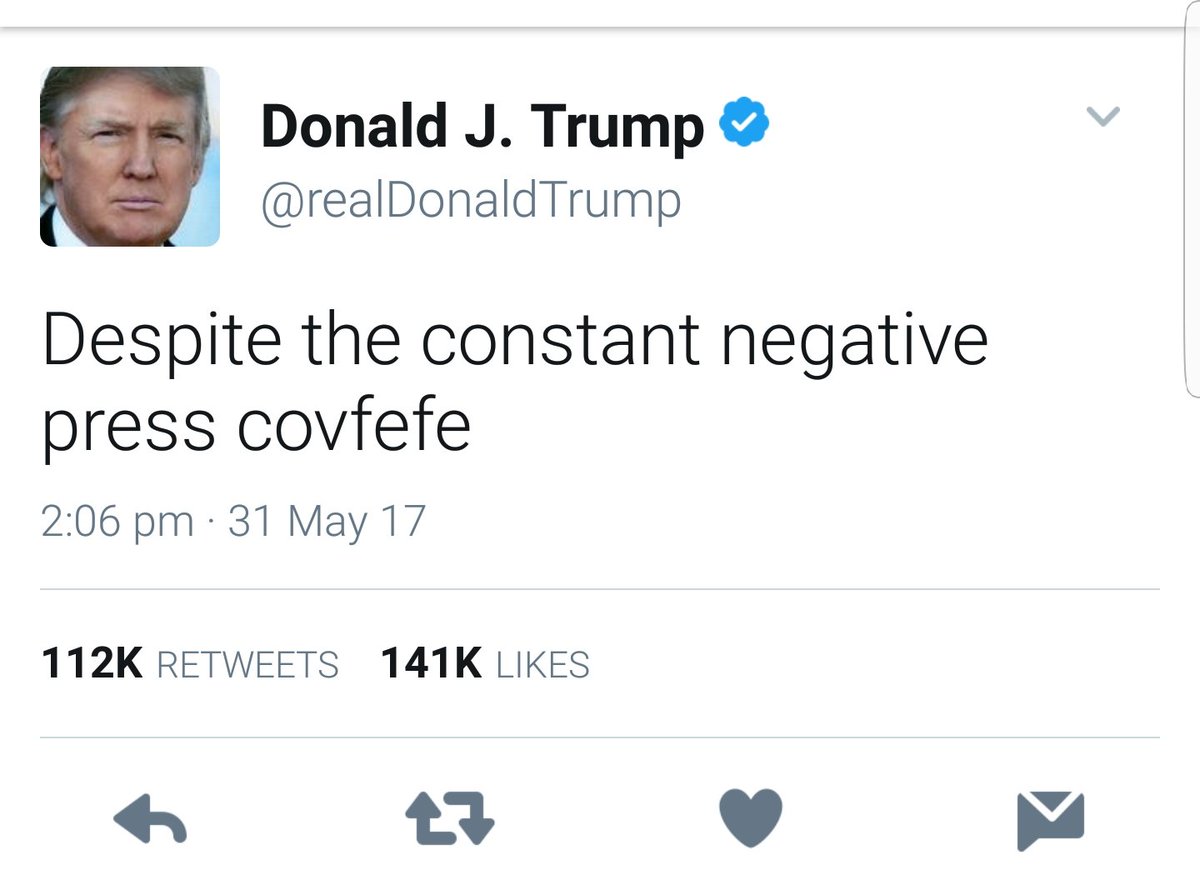 وأثار الرئيس الأميركي الجدل بعد كتابته تغريدة عبر حسابه، ذكر فيها كلمة “#Covfefe”، والتي حاول النشطاء معرفة معناها في كل اللغات إلا أنهم فشلوا في ذلك قبل أن يحذف التغريدة من حسابه ليستبدلها بأخرى، يمازح فيها ردود الفعل على الكلمة.