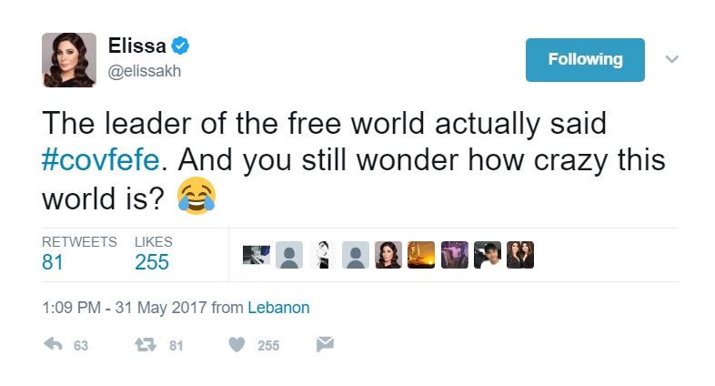 وقالت إليسا على حسابها الرسمي على موقع “تويتر”، “قائد العالم يستخدم “#Covfefe” .. ولا تزالوا متعجبين كيف أن هذا العالم مجنون؟”.