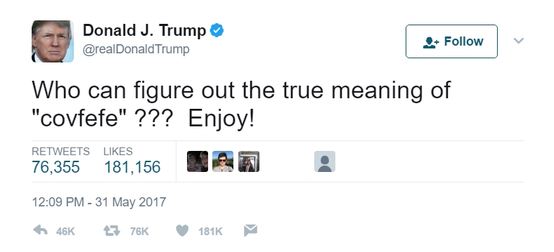وكان الرئيس الاميركي قد نشر على صفحته الرسمية على موقع “تويتر”، تدوينة تحتوي على كلمة غامضة باسم “сovfefe”، لا يوجد لها أساس في اللغة الإنجليزية، وسعى متابعيه لمعرفة المقصود منها وسط الكثير من السخرية والتخمينات لمعنى الكلمة.