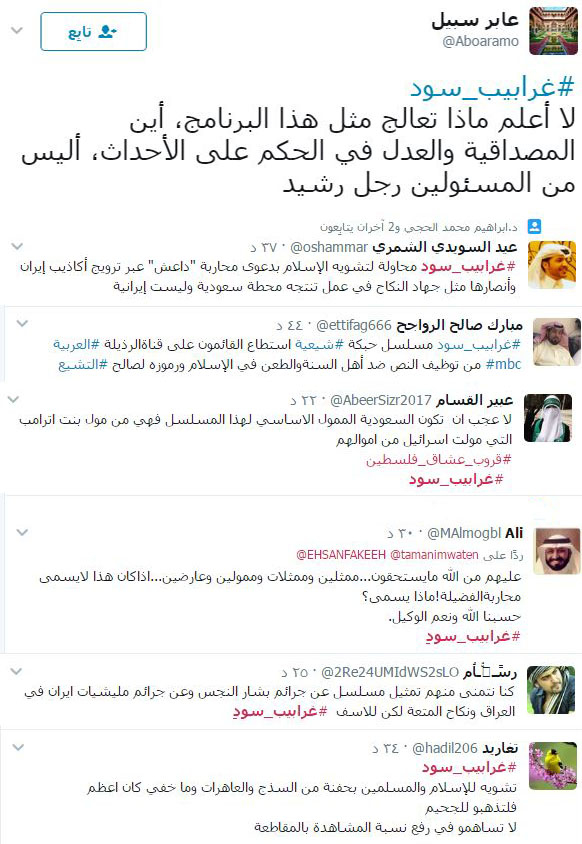 تشهد الأوساط العربية جدلًا لعرض قناة “MBC“ السعودية مسلسل “غرابيب سود”؛ لاعتباره يُقدِّم محتوى يُحارِب التديّن ويشوّه حلقات تحفيظ القرآن ويُحرِّف معلومات إسلامية سُنّية.