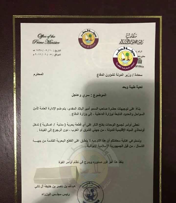 ونقلت الـ “CNN” عن المصدر قوله أن وزارة الدفاع القطرية بعثت رسالة إلى الحكومات السعودية والإماراتية والبحرينية، في 5 يونيو الجاري، حذرت فيها بأنها ستطلق النار على أي سفن تدخل مياهها من هذه الدول الثلاثة. وكان مسؤولون أمريكيون أفادوا بأن الوضع في قطر لم يؤثر على عمليات الجيش الأمريكي والأمن في قطر.