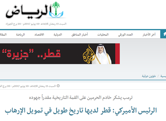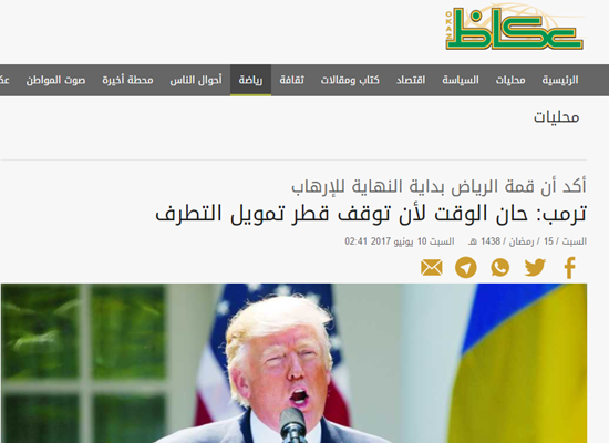 واستغلت الصحف السعودية، تصريحات الرئيس الاميركي ترامب، التي طالب فيها دولة قطر بالكف عن “تمويل الإرهاب، وأبرزتها في عناوين صحفها واهمها عكاظ والرياض والمدينة.