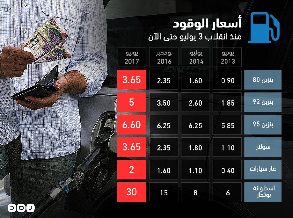 ومنذ انقلاب الثالث من يوليو ارتفعت أسعار الوقود؛ إذ كانت في بداية يونيو 2013 بسعر 0.90 لـ«بنزين 80»، ليصبح بسعر 3.65 جنيهات اليوم.