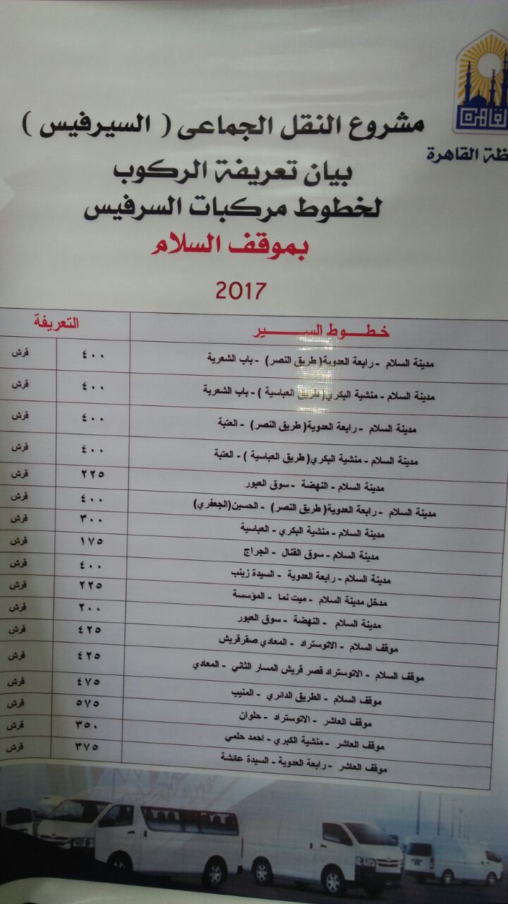 من جانبه، قال اللواء عمرو جمجوم رئيس جهاز تطوير وتجديد السيرفيس بالقاهرة، إنه تم تعليق اللافتات بمواقف العاصمة لتطبيق التسعيرة الجديدة، والتى أقرتها المحافظة لمنع الاحتكاك بين السائقين والركاب.