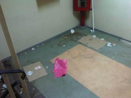 بعده توجهنا للنزول عبر السلم وهنا كانت الطامة الكبرى؛ حيث وجدنا أن السلم في الأدوار العليا ونظرًا لعدم استخدامه في ظل وجود المصعد تحول السلم إلى مقلب للقمامة؛ حيث تراصت فيه أعقاب السجائر وعلب السجائر الفارغة والعصير وهو ما جعل هناك صعوبة أصلًا في النزول وفي الخروج.