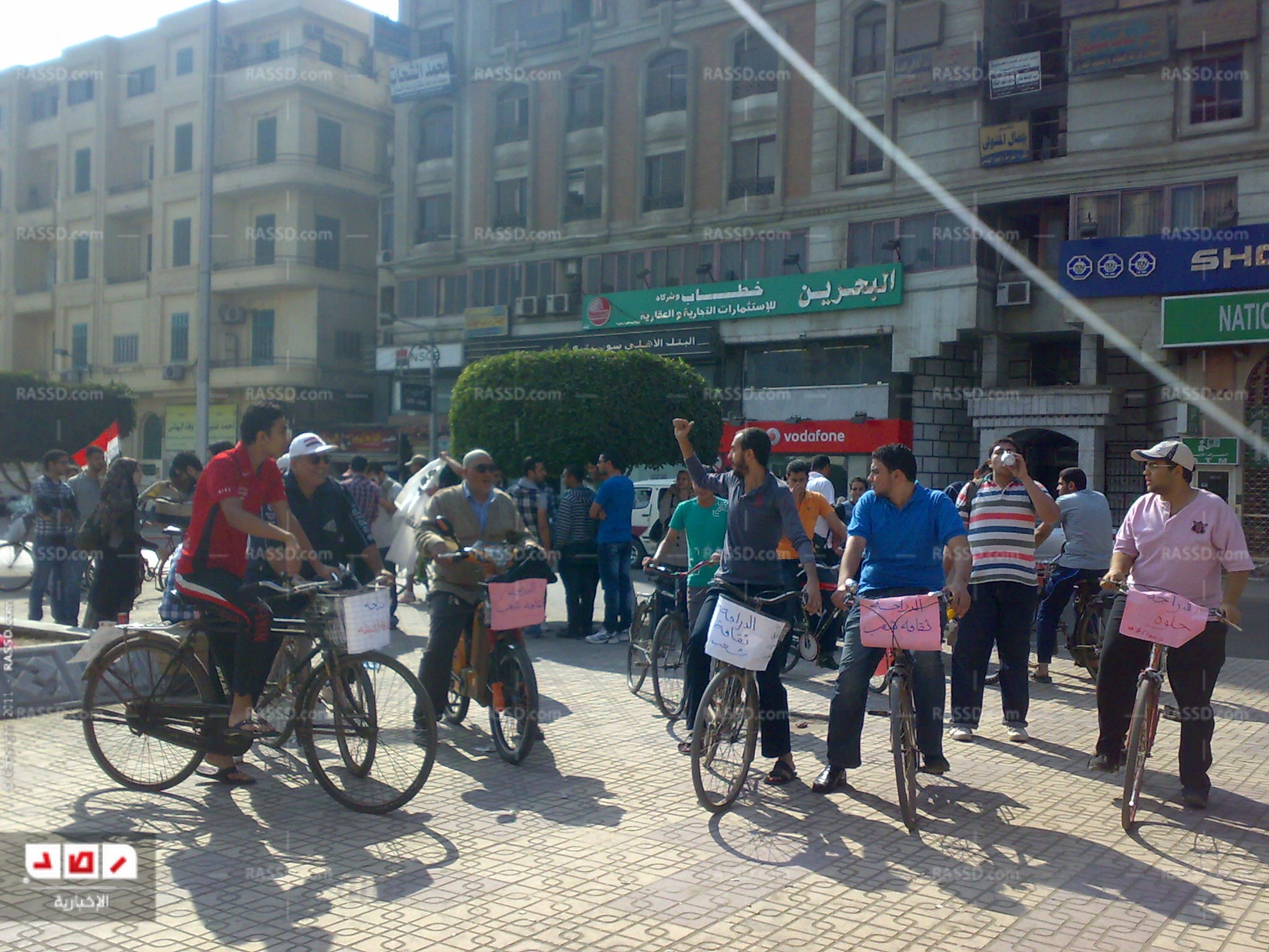 ورفع الشباب المشاركون في المسيرة لافتات مكتوبا عليها "الدراجة أوفر للطاقة"، "الدراجة وسيلة آمنة"، "الدراجة ثقافة شعب"، "الدراجة من أجل مرور هادئ"، "الدراجة آمنة للبيئة".