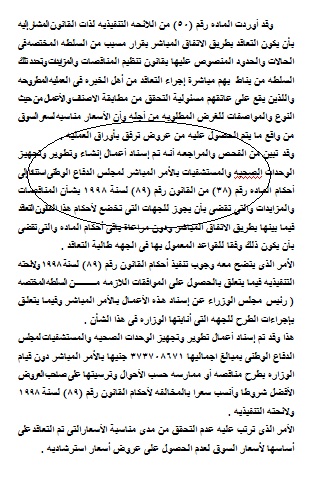 و تقضى أحكام قانون المناقصات والمزايدات أن يكون الطرح على أساس مواصفات كافية وفنية دقيقة وأن يكون التعاقد على أساس احتياجات فعلية وضرورية لسير العمل وبناء على دراسات موضوعية.