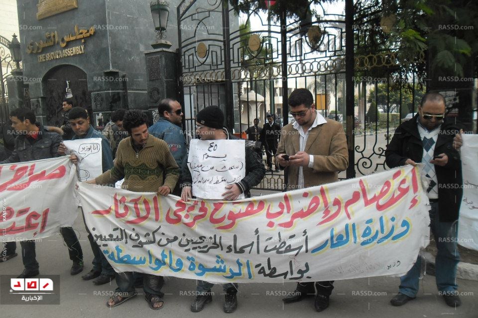 نظم العشرات من خريجي كليات الآثار من دفعة 2000 إلى 2010 على مستوى محافظات الجمهورية وقفة احتجاجية ظهر اليوم (الاربعاء ) أمام مجلس الشورى ، للمطالبة بالتعاقد في وزارة الآثار ومساواتهم بزملائهم اللذين تم قبولهم في التسعينات مؤكدين أن كل الخريجين من الدفع السابقة والذين يبلغ عددهم نحو 6 آلاف خريج تم التعاقد معهم ولكن هناك خمسون خريج سقطن أسمائهم في كشوف المقبولين ورفضت الوزارة قبولهم.