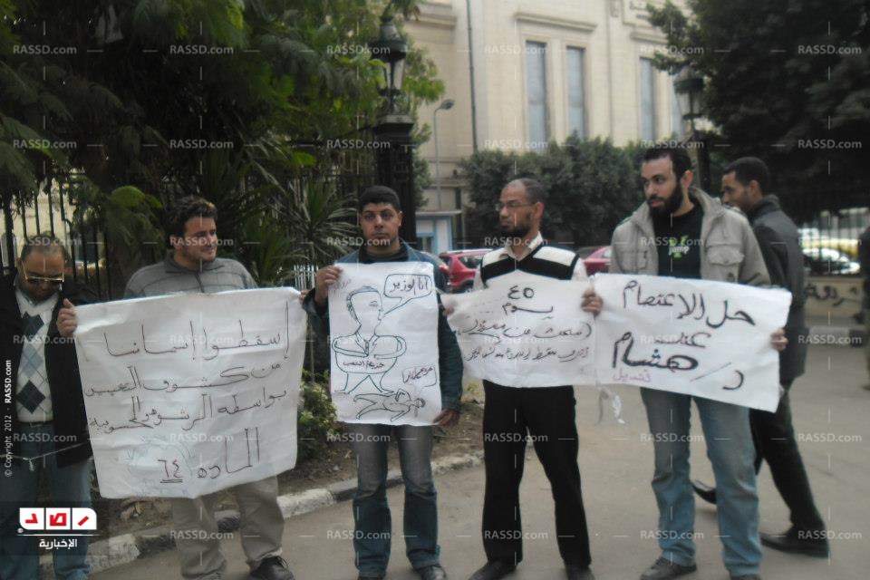 ورفعوا لافتات مكتوبا عليه :" اسقطوا أسمائنا من التعين بواسطة الرشوة والمحسوبية والمادة 64 "، و "صراخ الخريجين ونوم المسئولين "، و " حل الاعتصام عند هشام قنديل ".
