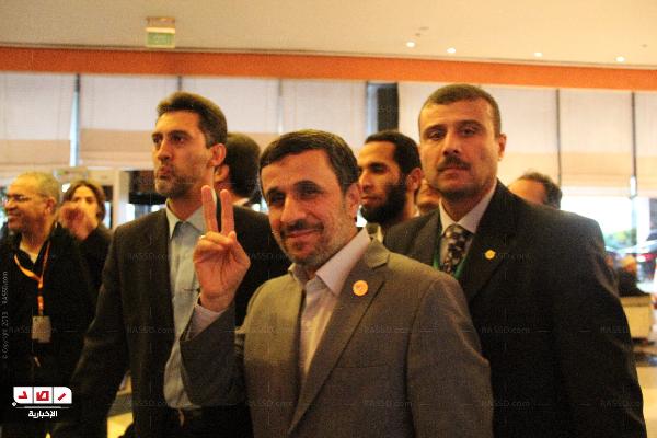 لم يتوقف نشاط الرئيس الإيراني محمود أحمدي نجاد منذ لحظة وصوله لمصر حتي الآن، يكفي انه أول رئيس ايراني يزور مصر منذ قيام الثورة الإسلامية ، ولاحظ عدد كبير ممن تابع "نجاد" في مؤتمر القمة الإسلامية الـ12 بابتسامة دائمة علي وجهه ، والتقطت شبكة رصد الإخبارية صورة للرئيس الإيراني وهو يشير بعلامة النصر أمام عدسات المصورين أكثر من مرة أخرها اليوم بعد انتهاءه من المؤتمر الصحفي الذي عقده في منزل مدير مكتب رعاية المصالح الإيرانية.