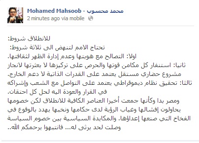 و قال محسوب على صفحته الشخصية على موقع التواصل الاجتماعي " فيس بوك" إن ثاني شروط إطلاق الأمم للأمام هو استنفار كل مكامن قوتها والحرص على تركيزها لا بعثرتها لانجاز مشروع حضاري مستقل يعتمد على القدرات الذاتية لا دعم الخارج.