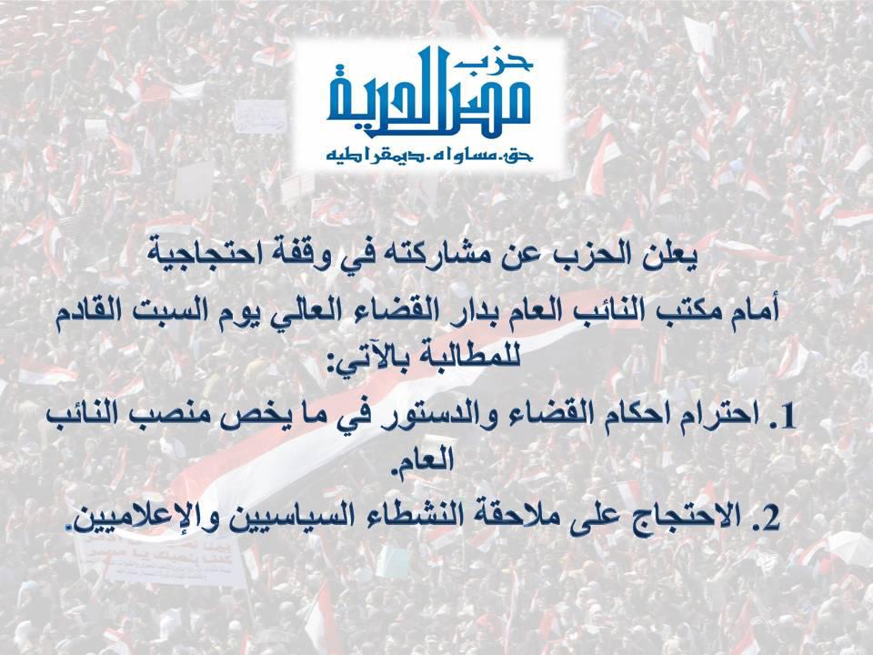 أعلن حزب مصر الحرية أمس(الجمعة) عن مشاركته في وقفة احتجاجية أمام مكتب النائب العام بدار القضاء العالي اليومللمطالبة باحترام أحكام القضاء، والدستور في ما يخص منصب النائب العام، والاحتجاج على ملاحقة النشطاء السياسيين والإعلاميين.
