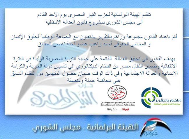 أكد حزب التيار المصري أن هيئته البرلمانية ستتقدم لمجلس الشورى غدًا (الأحد) بمشروع قانون العدالة الانتقالية.