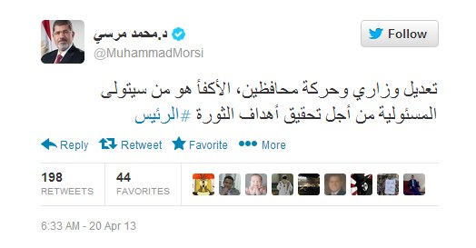 قال الرئيس محمد مرسي اليوم السبت على صفحته الرسمية على موقع التواصل الاجتماعي "تويتر" إن هناك تعديل وزاري و حركة محافظين .
